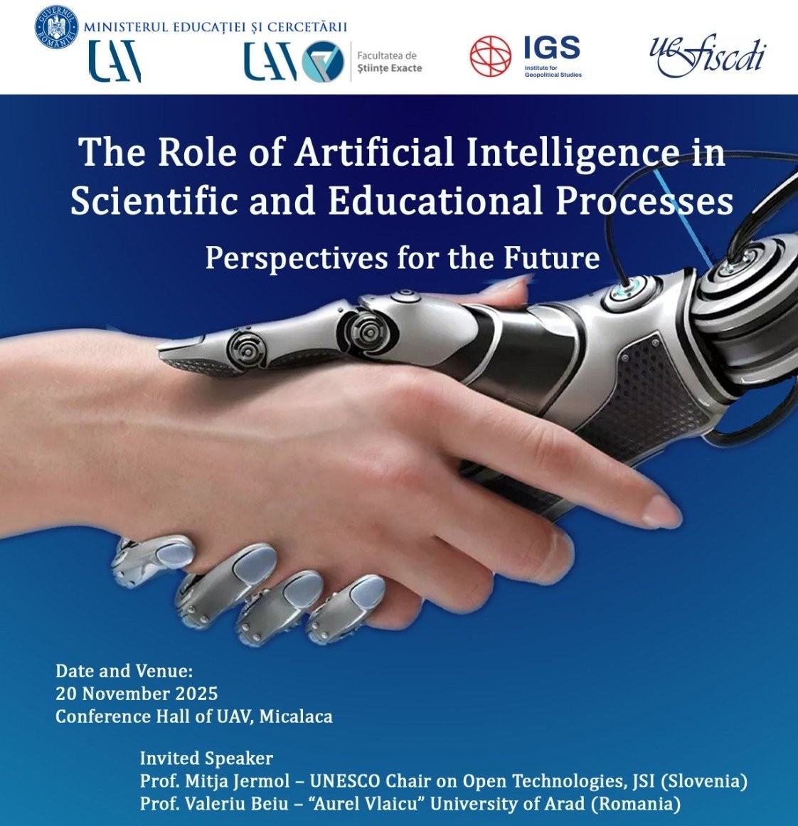 O dezbatere provocatoare  pe care Universitatea „Aurel Vlaicu” din Arad, alături de Institute for Geopolitical Studies și Research Centre for Mathematical Models and Computer Systems din cadrul UAV, o propune celor interesați de modul în care inteligența artificială poate fi integrată în procesele științifice și educaționale.